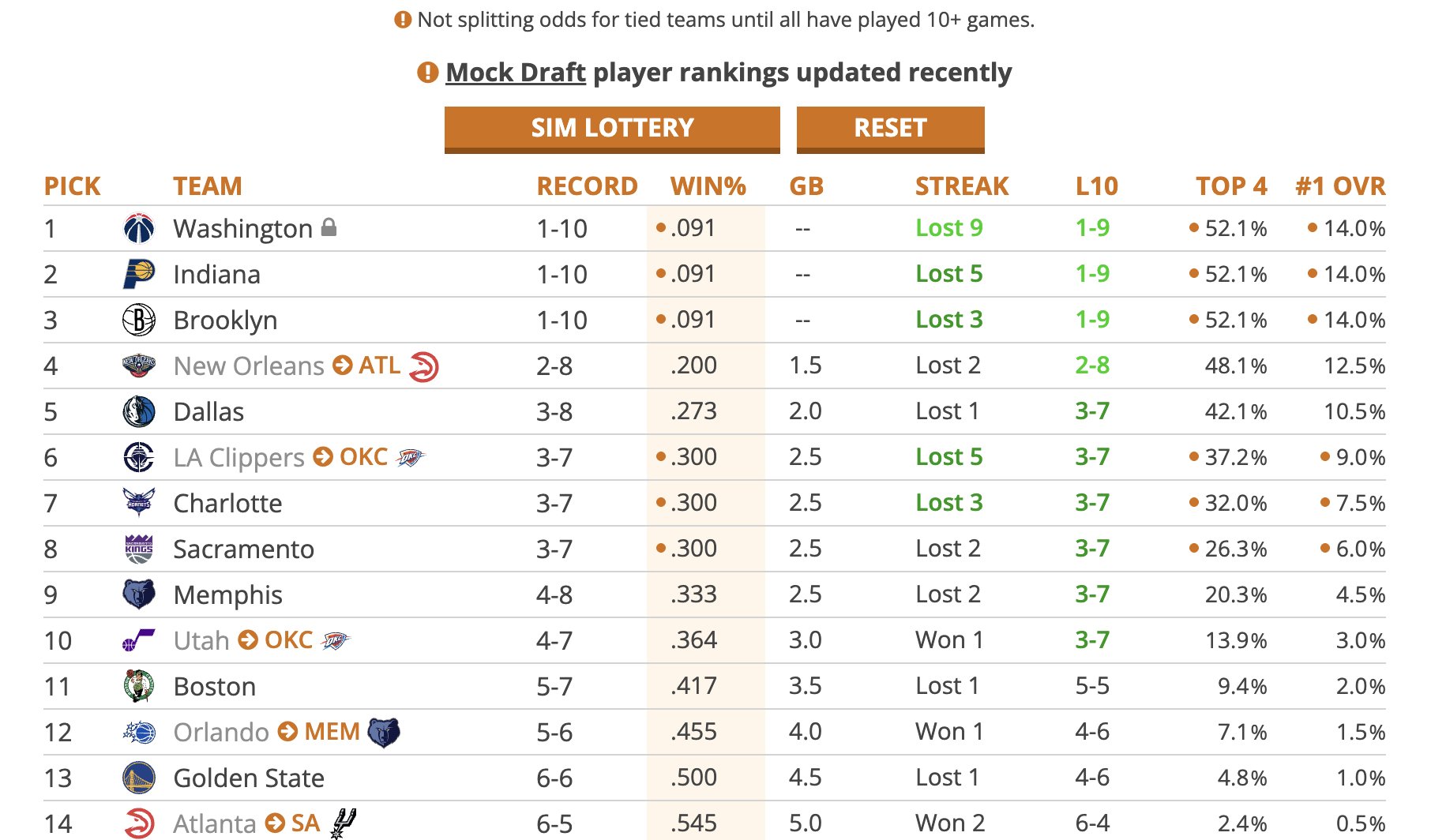 6686體育11月12日訊美媒Tankathon根據目前聯盟各隊的戰績,今日更新了2026年選秀抽籤的機率,奇才、步行者、籃網三隊由於戰績都是1勝10負,抽到狀元籤的機率都是14%,抽到前四順位的機率為52.1%。