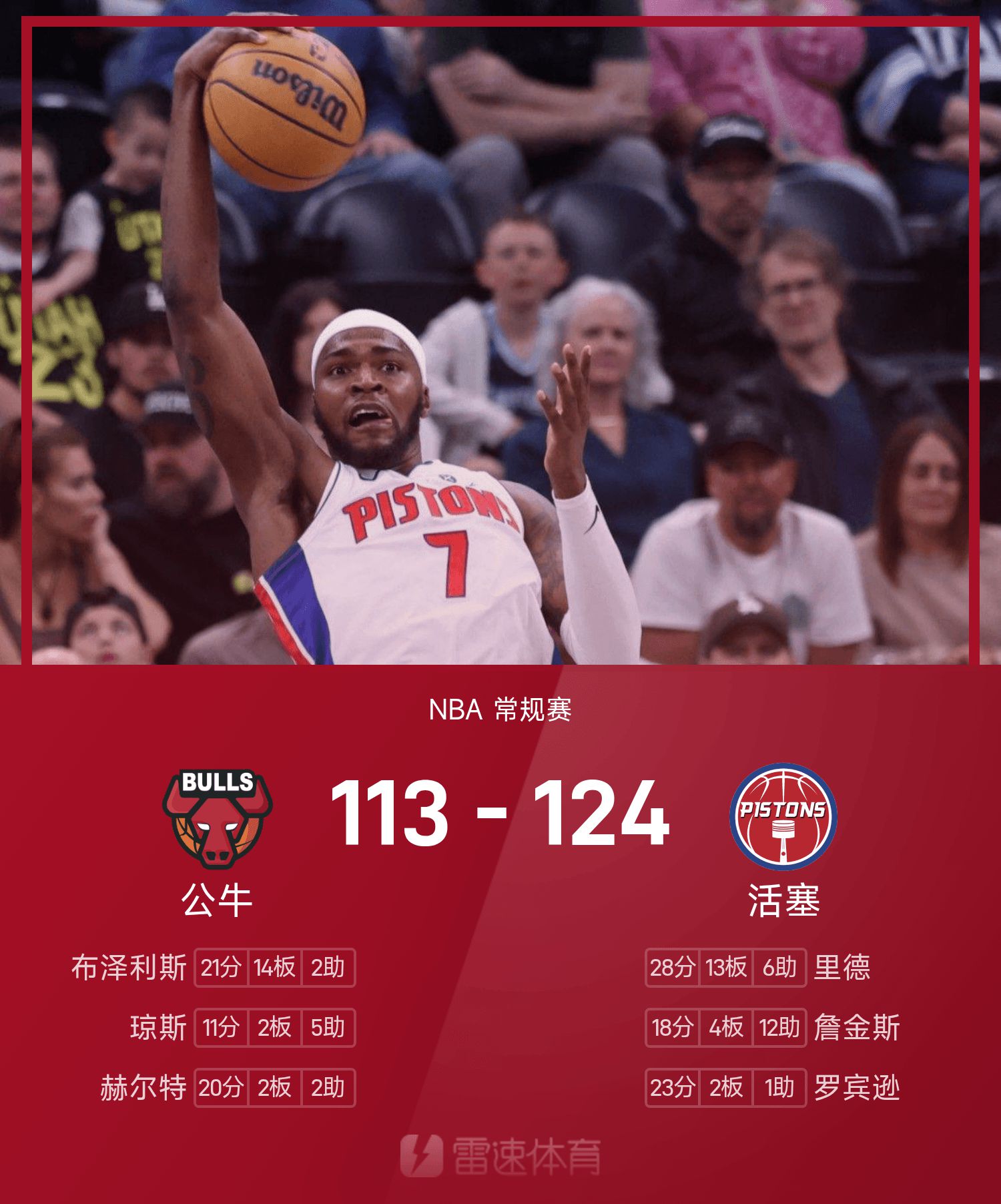 NBA戰報:里德28分12板6助,活塞124-113擊敗公牛