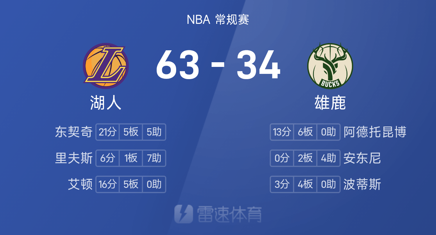 NBA半場:東契奇21分,雄鹿8分半合砍5分,湖人63-34雄鹿