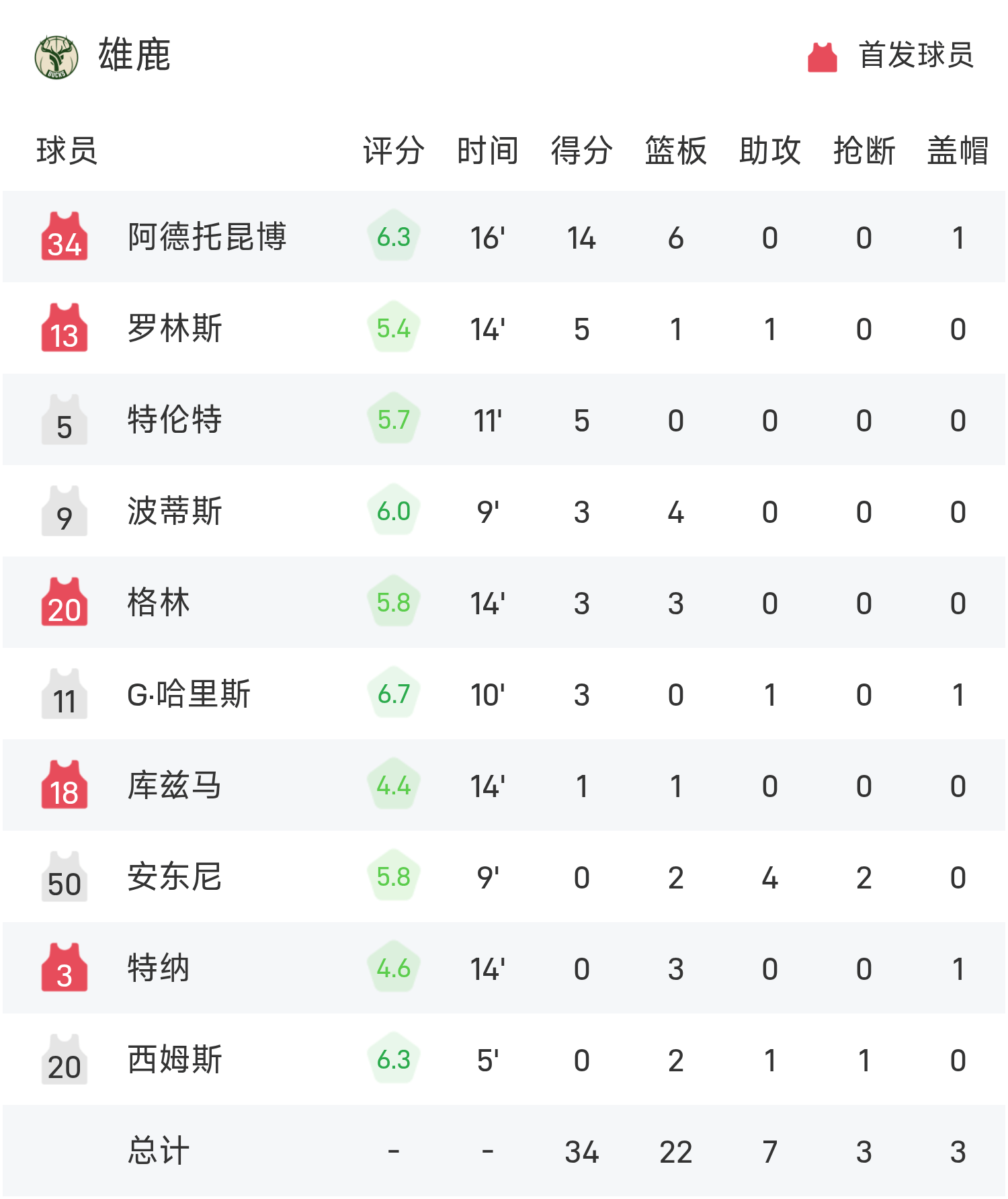 東契奇砍下全場最高的21分5板5助,字母哥14分5差錯,庫茲馬6投0中僅得1分。