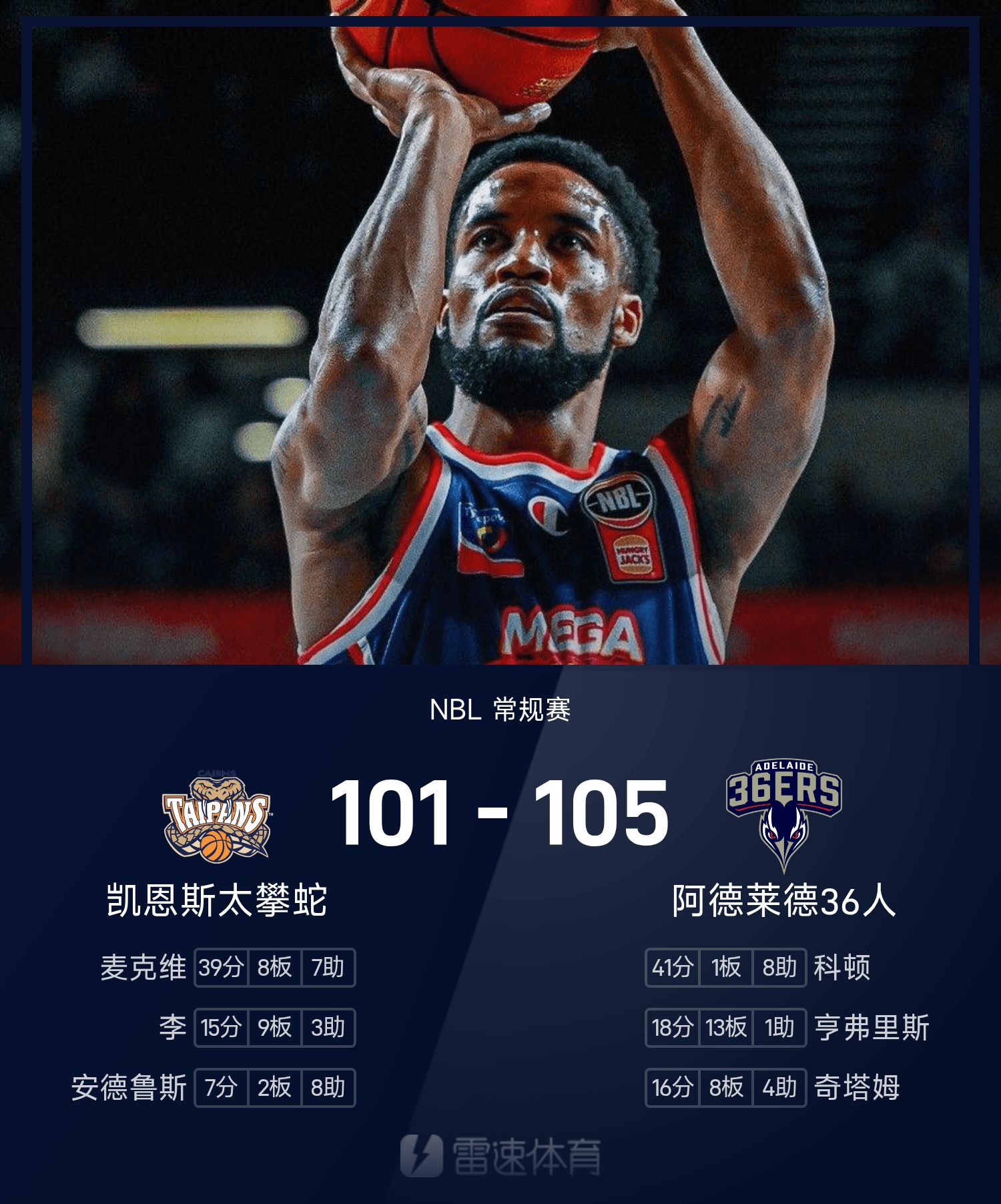 雙方全場戰罷,阿德雷德36人105-101擊敗凱恩斯太攀蛇。