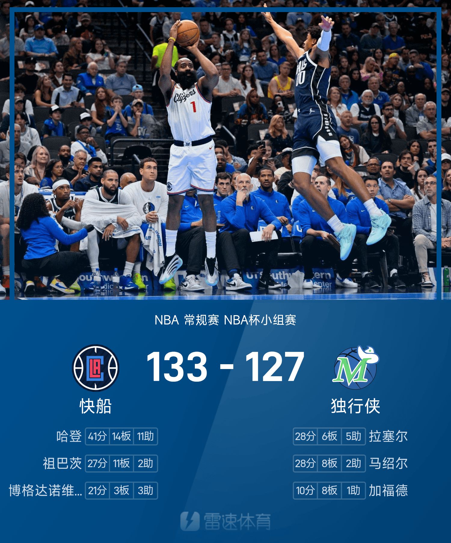 NBA盃戰報:哈登41分三雙,快艇133-127雙延長賽擊敗獨行俠