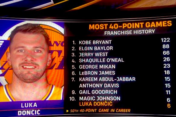 美國電視台統計了湖人隊史單場40+場次:東契奇已經扳平局魔術師並列第十,勒布朗以18次排第六,科比122次領跑。