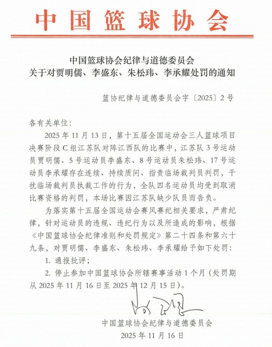 6686體育11月16日訊中國籃球協會紀律與道德委員會官方宣布,給予全運會三人籃球項目江蘇隊隊員賈明儒、李盛東、朱松瑋和李承耀通報批評和停頓參加中國籃協所轄賽會活動1個月的處罰,原因是他們四人存在連續、持續質問、指責臨場裁判員裁決、幹擾臨場裁判員工作的行為。公告原文如下: