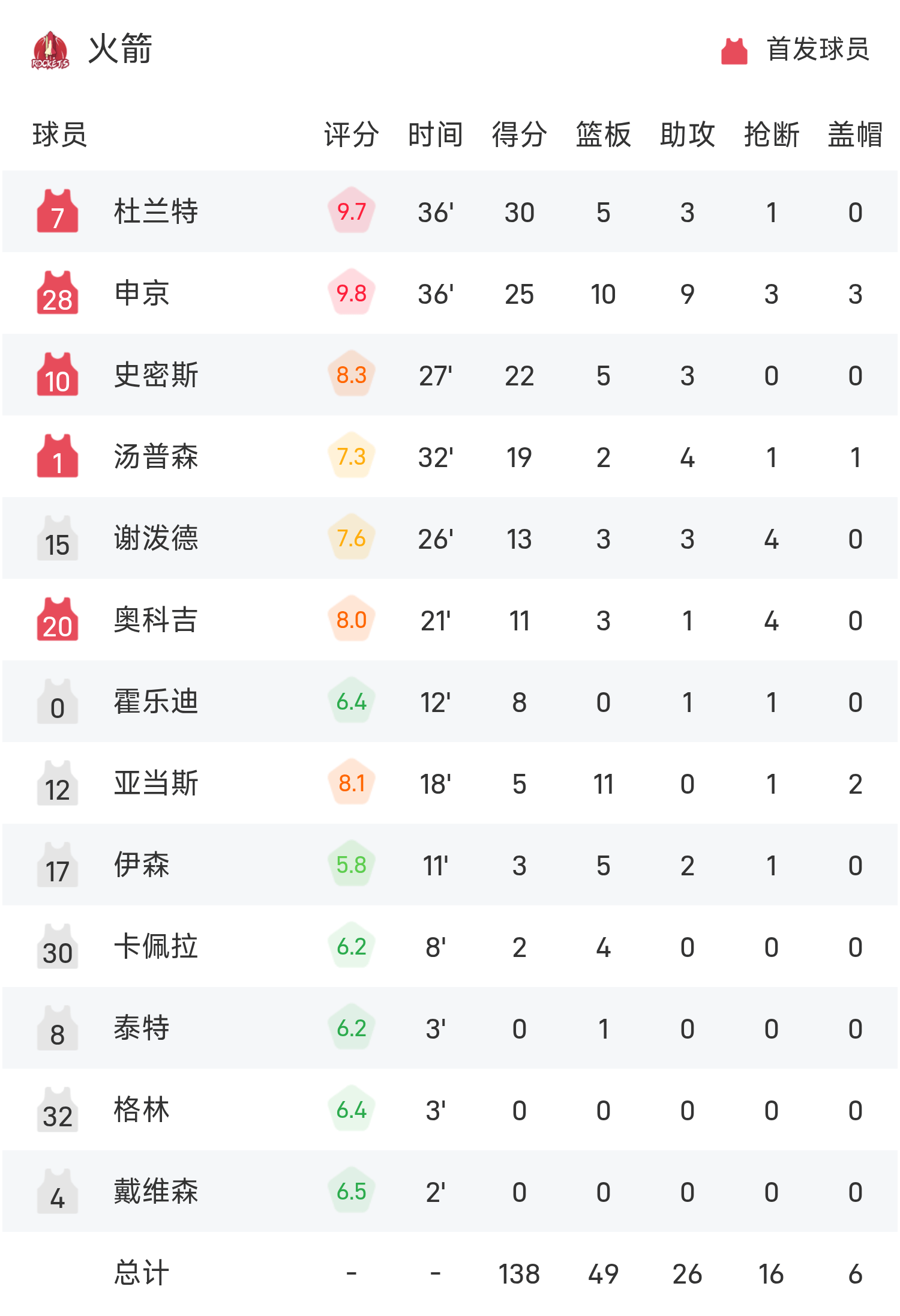 NBA盃戰報:杜蘭特30分,火箭140-116大勝拓荒者