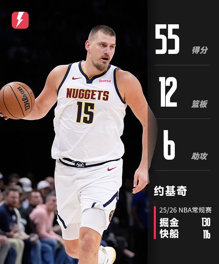 本場比賽約基奇出賽33分34秒,23投18中,其中三分球6投5中,罰籃16罰14中,砍下55分12搶籃板6助攻1截1封蓋2差錯的神級數據。