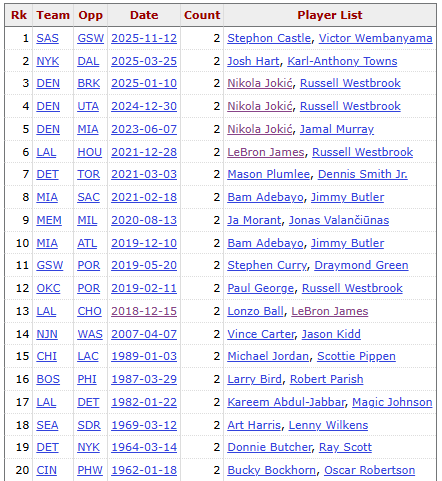 算上今天的文班亞馬和卡斯爾,NBA史上一共出現過20次同場同隊球員同時砍下三雙的神蹟。其中三雙王威少參與其中4次最多,約基奇參與3次排名第二,兩人有兩次同場砍下三雙,也是史上唯一一對。詹姆斯參與其中兩次。除了三人之外,其餘沒有球員能超過1次。