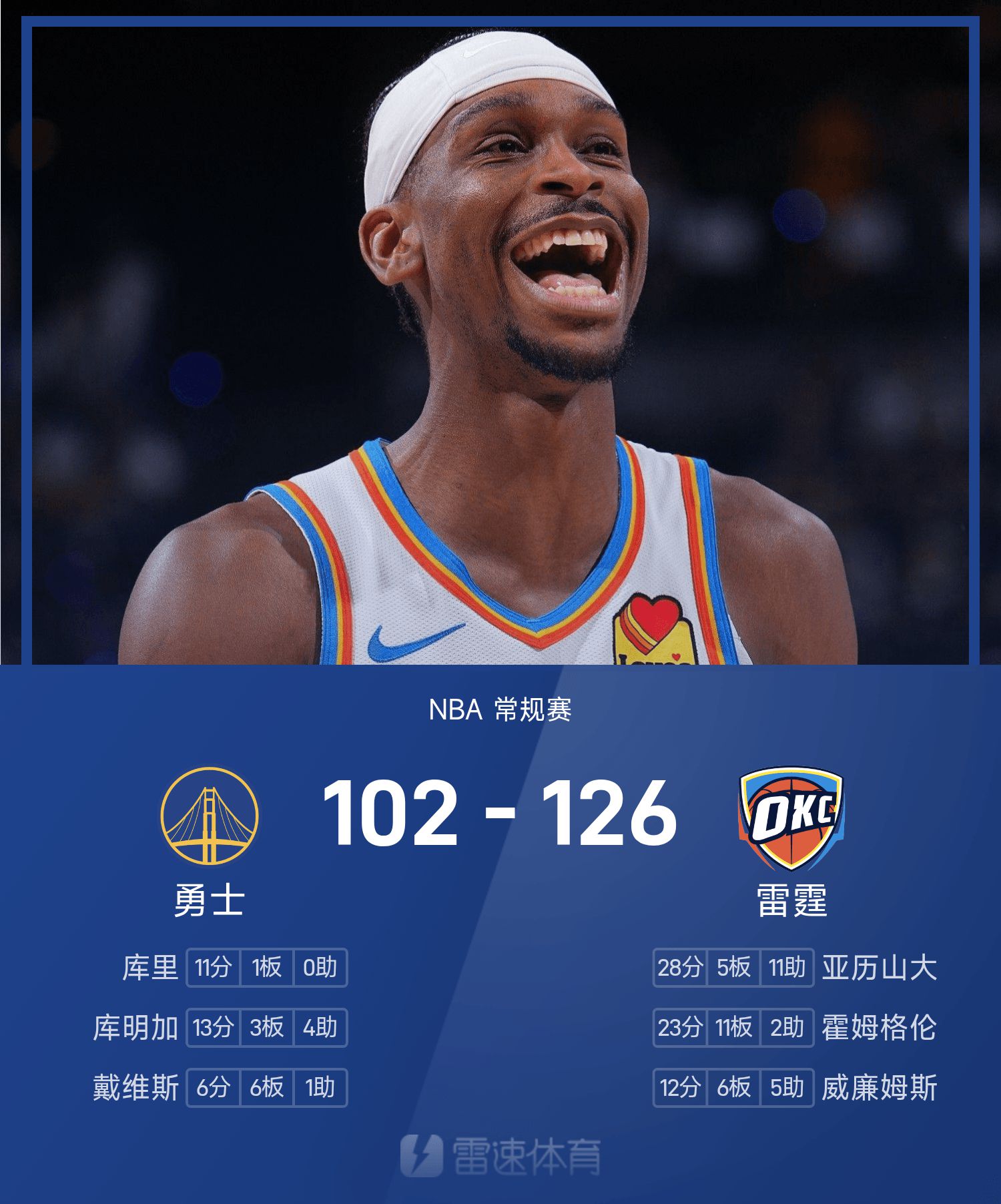 NBA戰報:亞歷山大28分11助,雷霆126-102大勝勇士