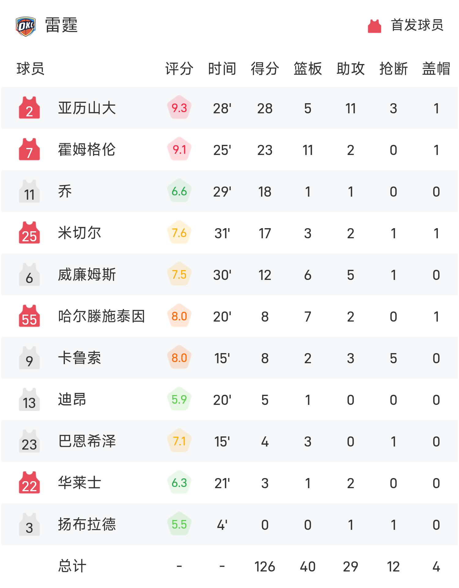 6686NBA11月126雙方全場戰罷,雷霆124-102戰勝勇士。亞歷山大砍下全場最高的28分5板11助,率領雷霆勝利獲勝。