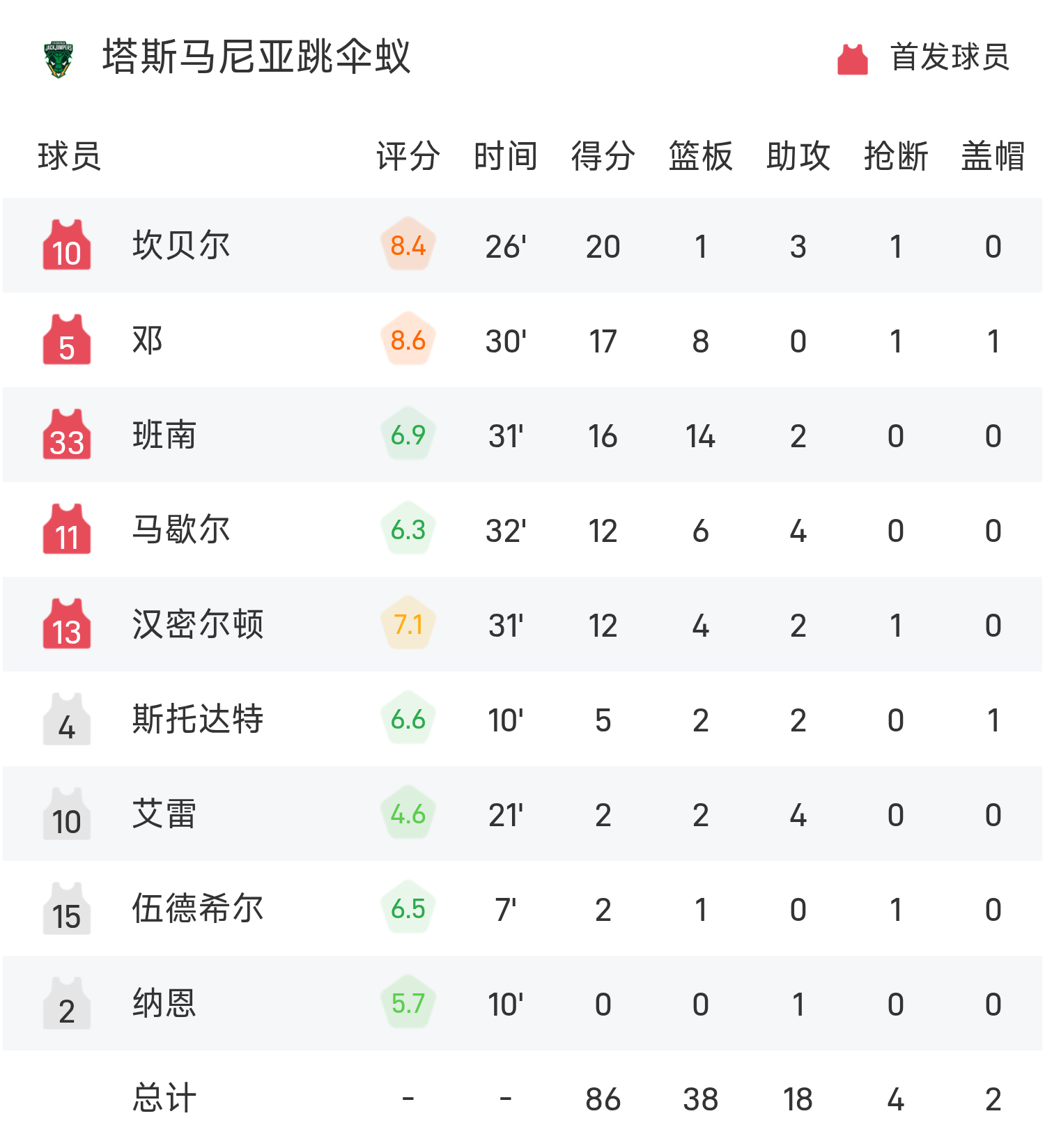 雙方全場戰罷,塔斯馬尼亞跳傘蟻86-97不敵阿德萊德36人。