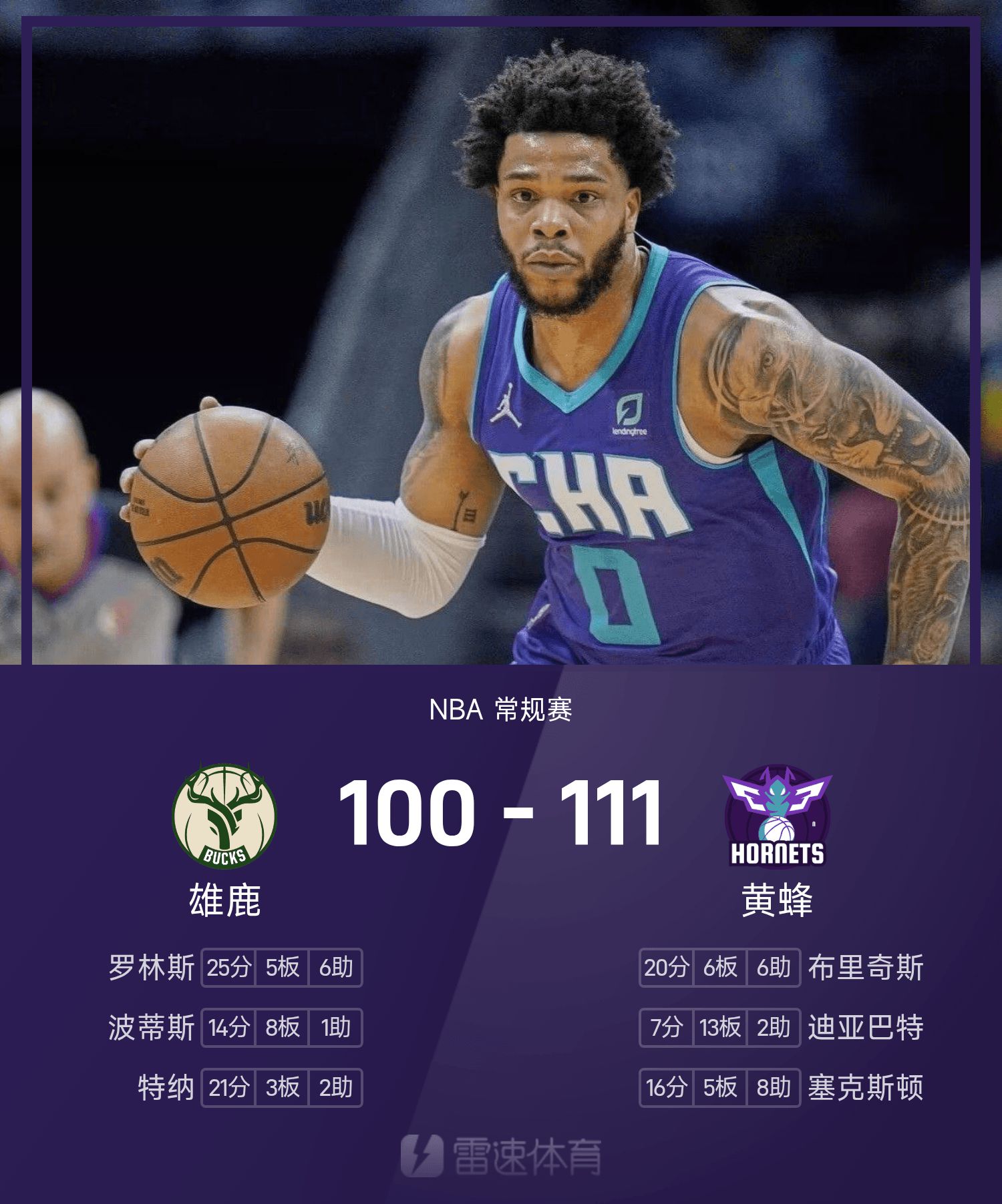 NBA戰報:布里奇斯20分6板6助,黃蜂111-100擊敗雄鹿