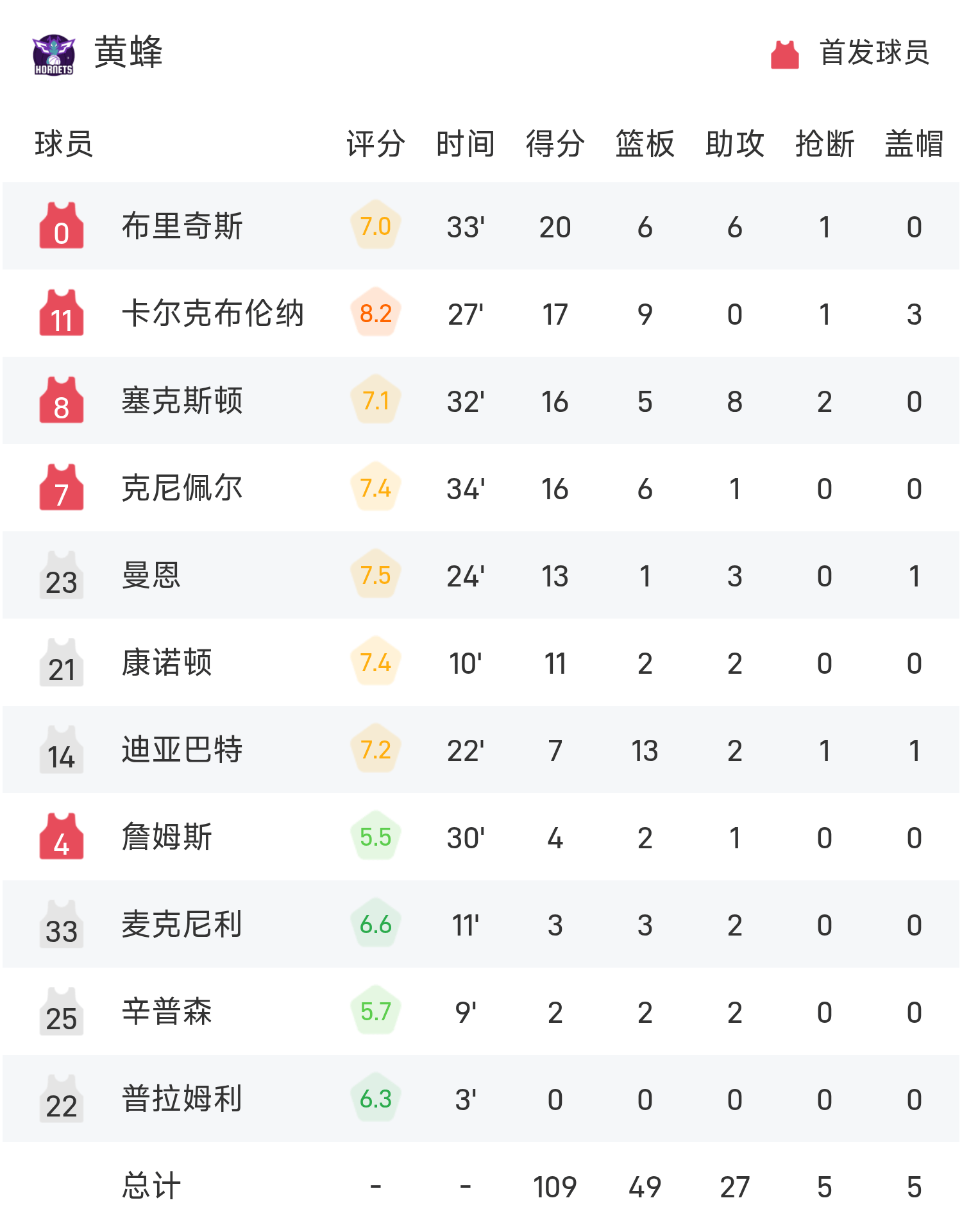 雙方全場戰罷,黃蜂111-100戰勝雄鹿。