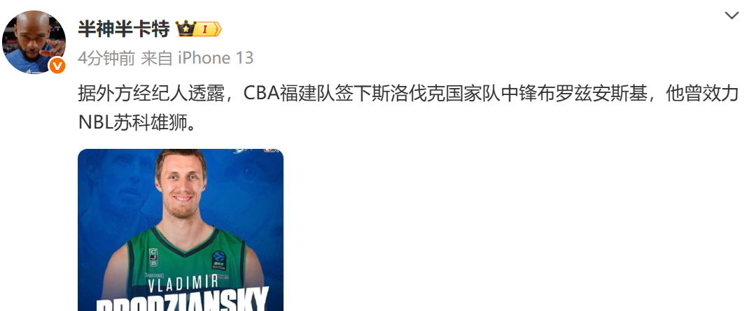 媒體人:福建男籃簽下斯洛伐克國家隊五號布羅茲安斯基