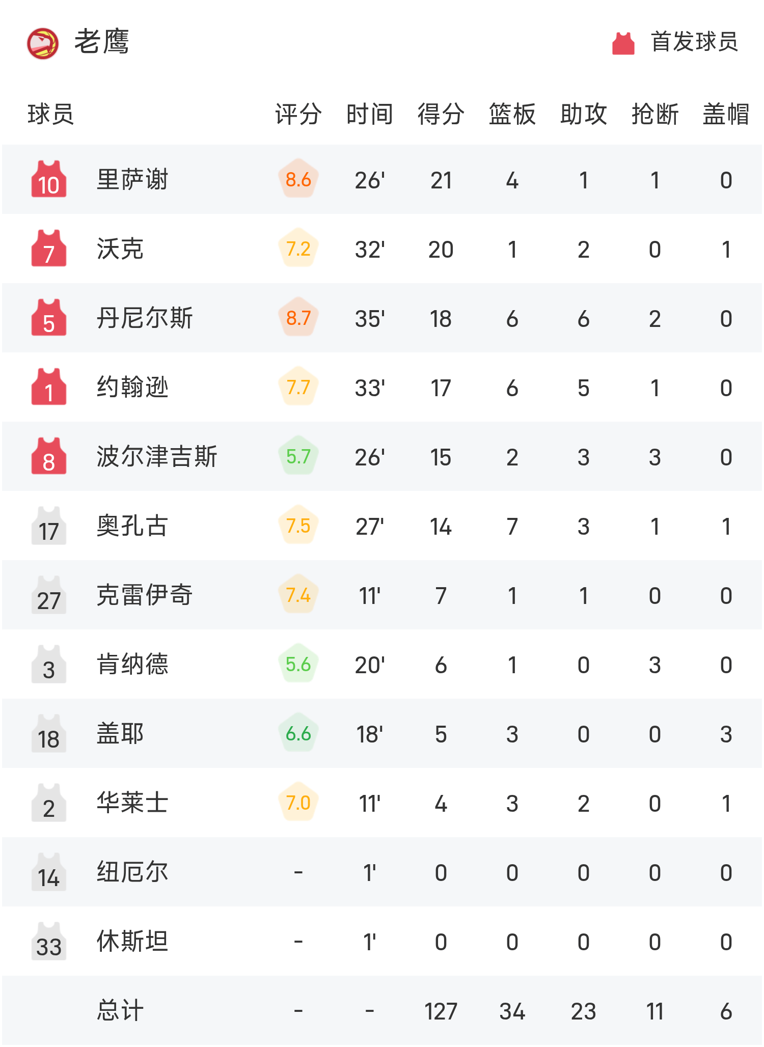 NBA戰報:裡薩謝21分,老鷹127-112輕取魔術
