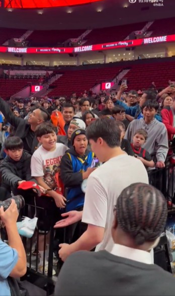 人氣爆棚!大批球迷在通道等待楊瀚森,他將籃球鞋送給小球迷