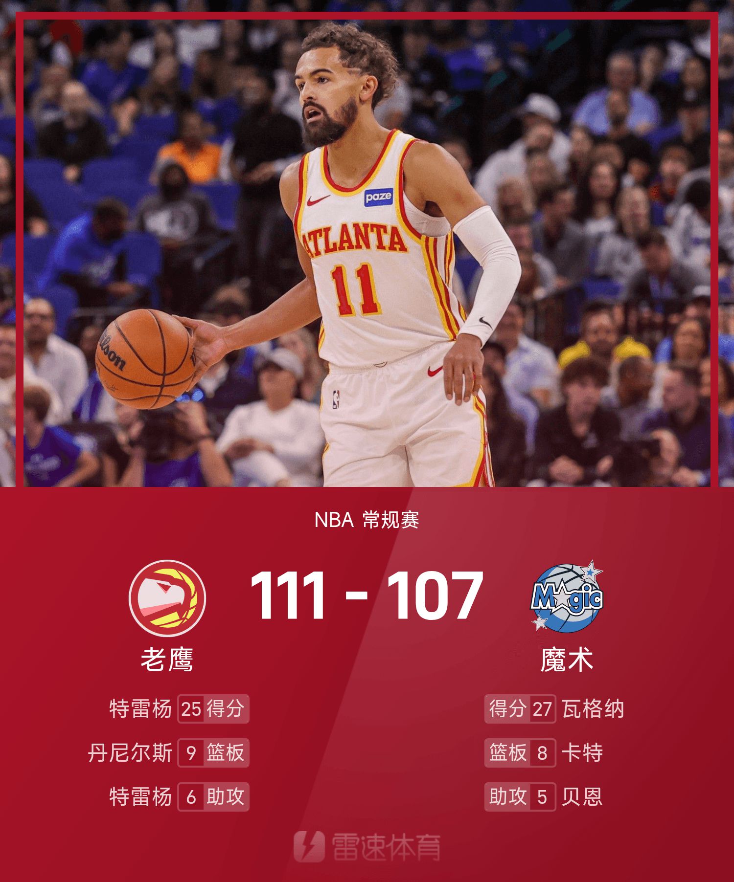 NBA戰報:特雷楊25分6助,老鷹111-107險勝魔術
