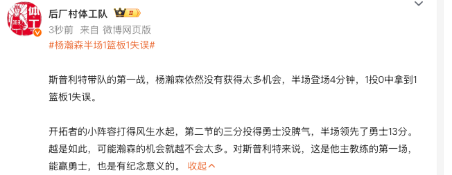 拓荒者的小陣容打得風生水起,第二節的三分球投得勇士沒脾氣,半場領跑位了勇士13分。越是如此,可能瀚森的機會就越不會太多。對斯普利特來說,這是他教練的第一場,能贏勇士,也是有紀念意義的。