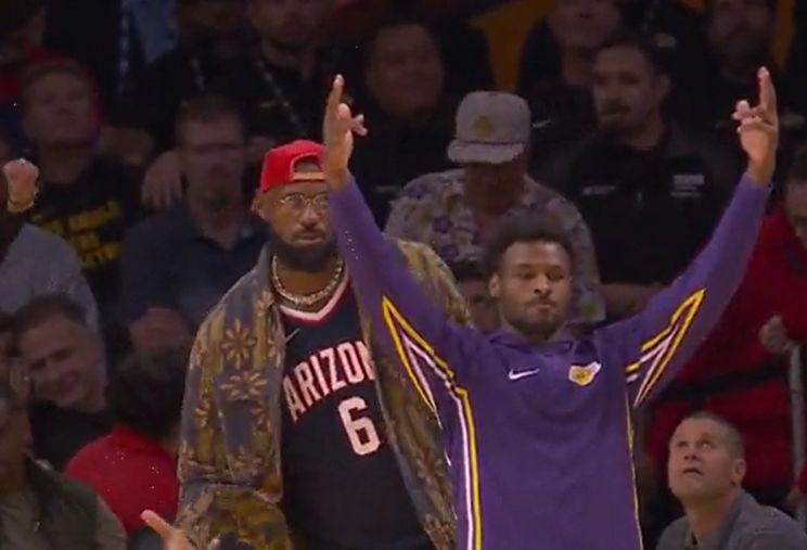 史馬特命中三分球扳平手賽果分時,詹姆斯和布朗尼一起在場邊慶祝。