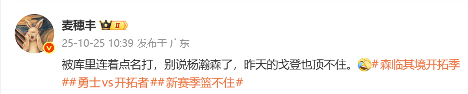 媒體人@麥穗豐發文寫道:「被庫裡連著點名打,別說楊瀚森了,昨天的戈登也頂不住。」