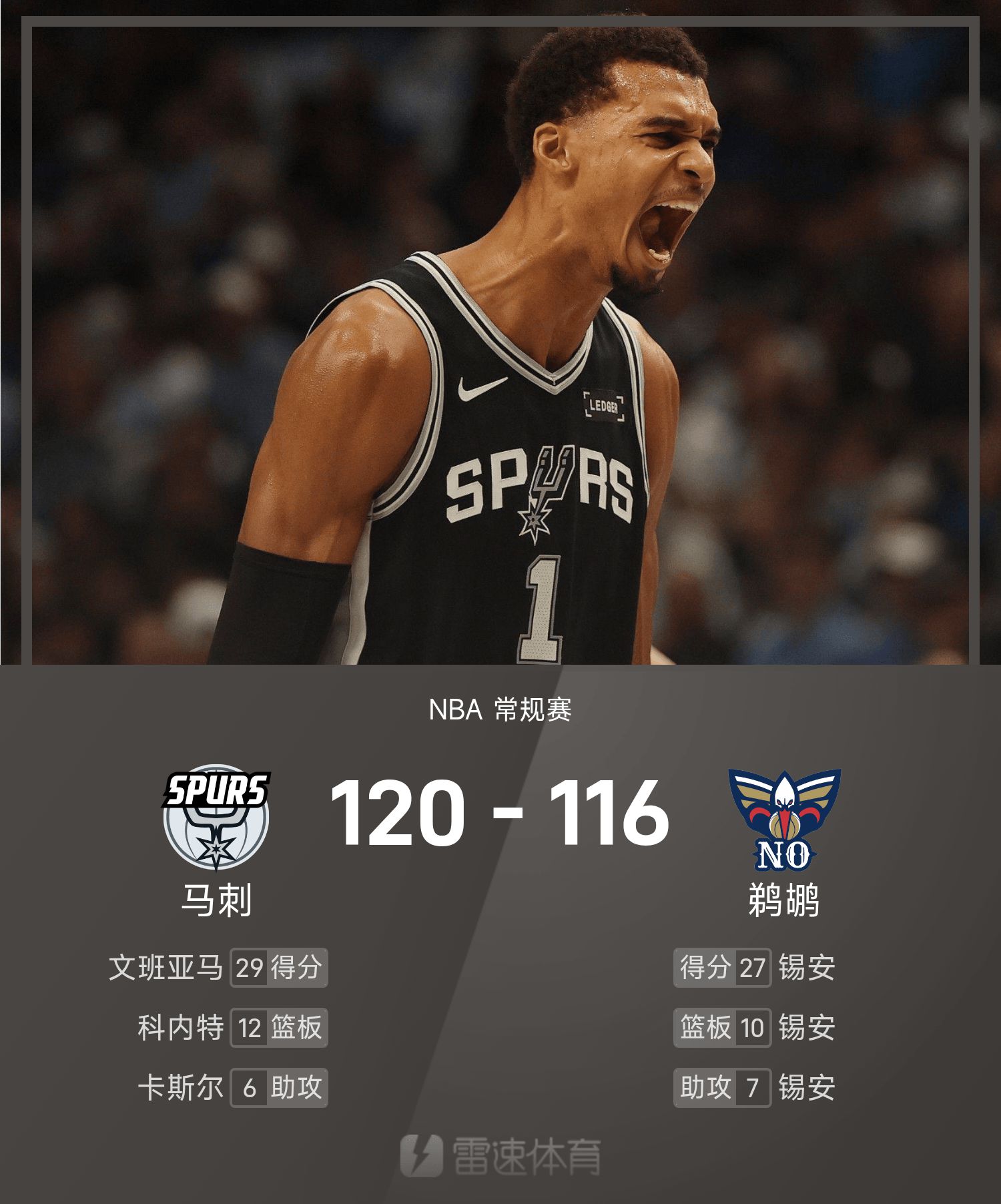 NBA戰報:文班亞馬29分9帽,馬刺120-116延長賽險勝鵜鶘