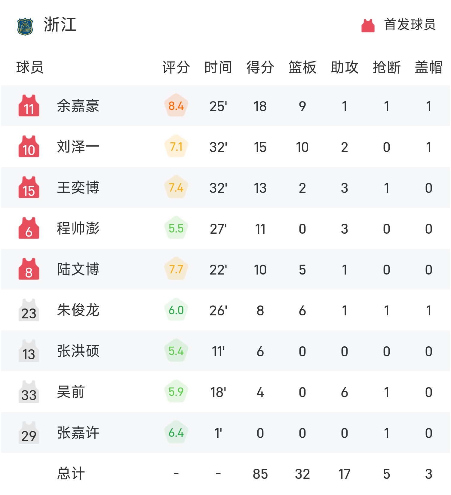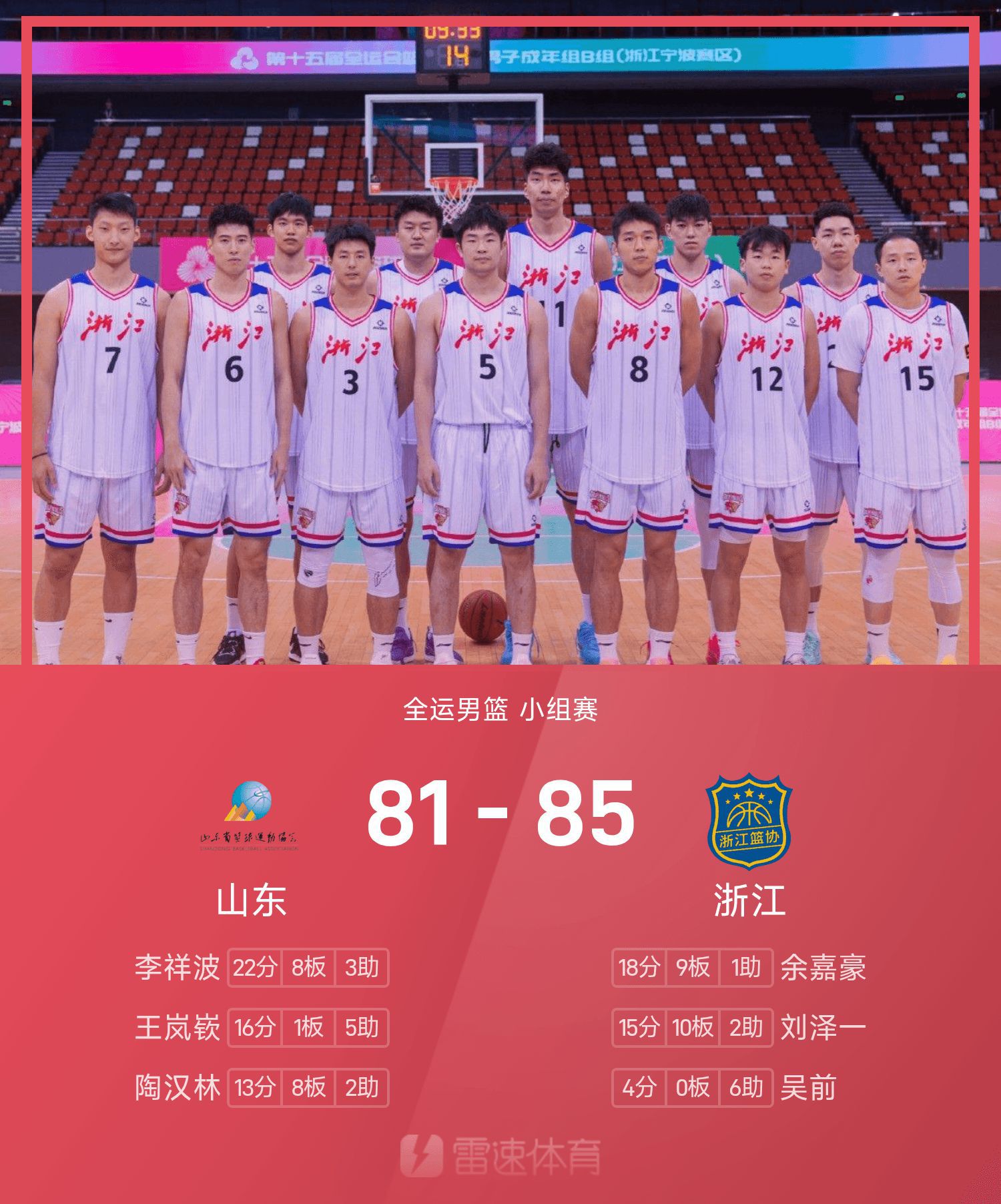 全運男籃戰報:餘嘉豪18分9板,浙江85-81險勝山東