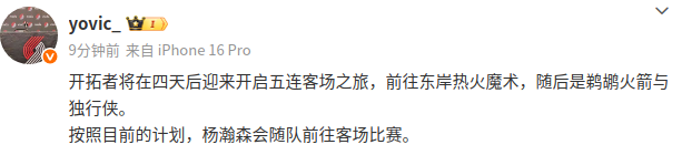 社媒原文:「拓荒者將迎來開啟五連客隊場之旅,前往東岸熱火、魔術,隨後是鵜鶘、火箭與獨行俠。按照目前的計劃,楊瀚森會隨隊前往客隊場競賽。」