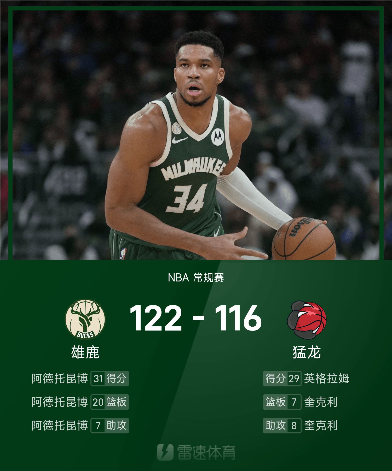 NBA戰報:阿德托昆博31分20板7助,公鹿122-116擊敗暴龍