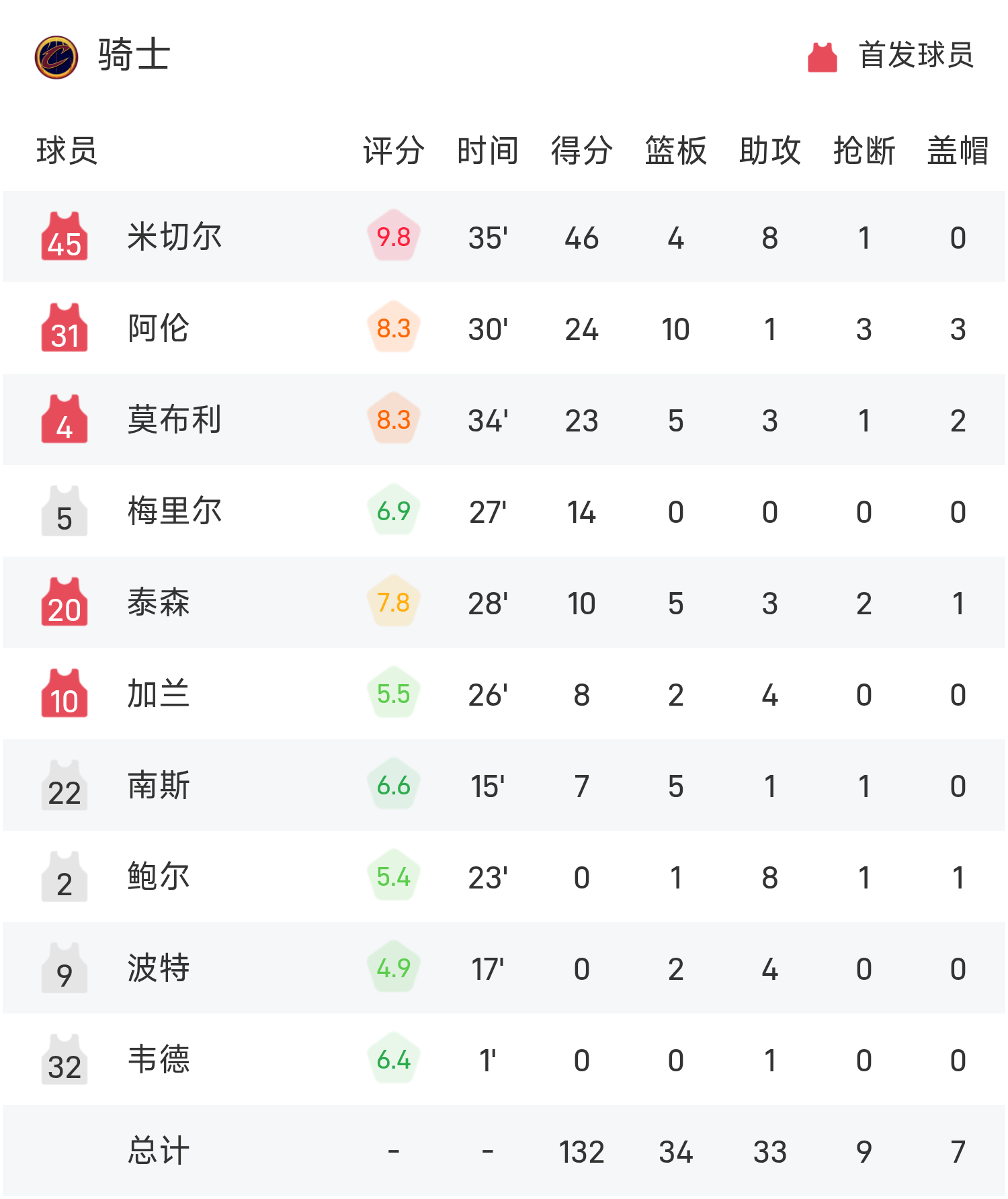 NBA戰報:米契爾46分8助,騎士132-121擊敗76人