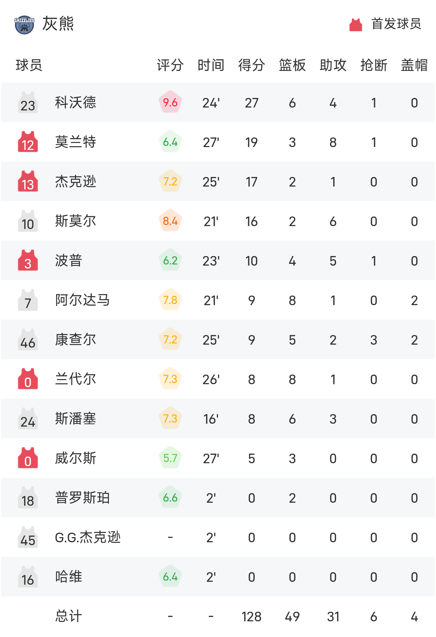 NBA戰報:科沃德27分6板,灰熊128-103大勝步行者