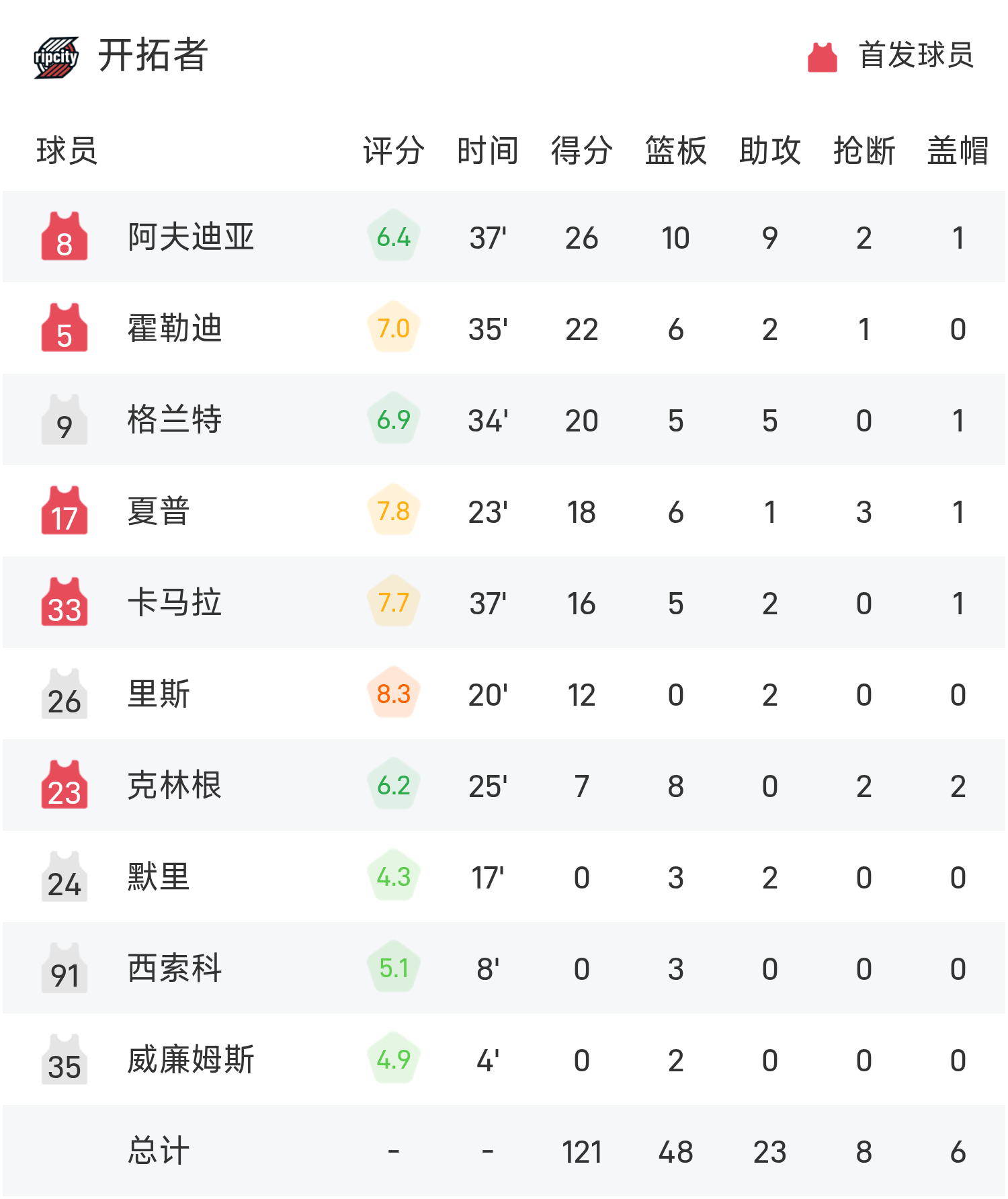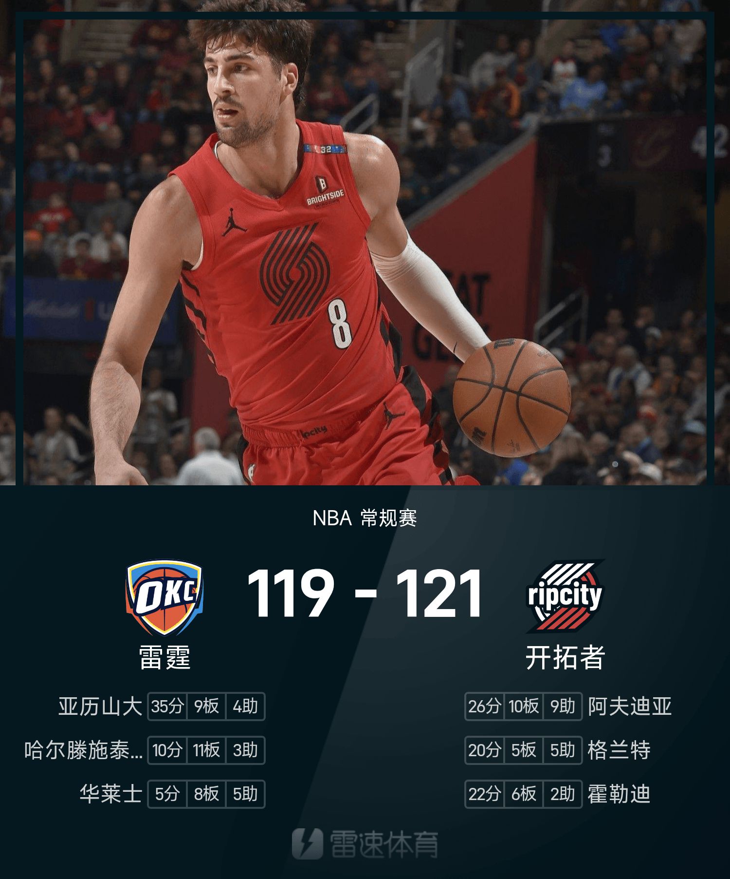NBA戰報:阿夫迪亞26分,楊瀚森未登場,拓荒者121-119雷霆