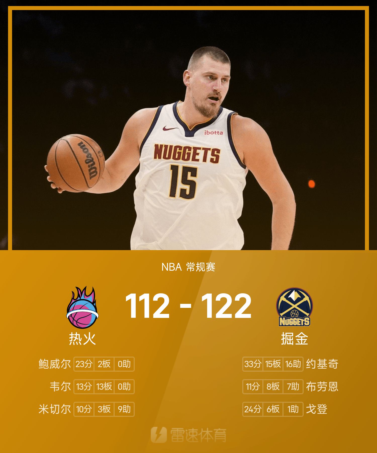 NBA戰報:約基奇33分15板16助,掘金122-112擊敗熱火