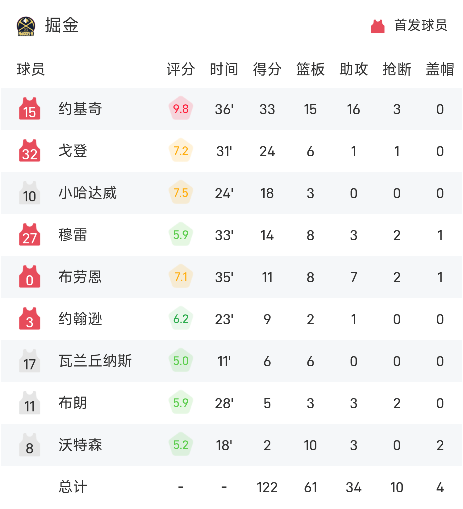 約基奇砍下全場最高的33分15板16助,率領掘金勝利取勝。