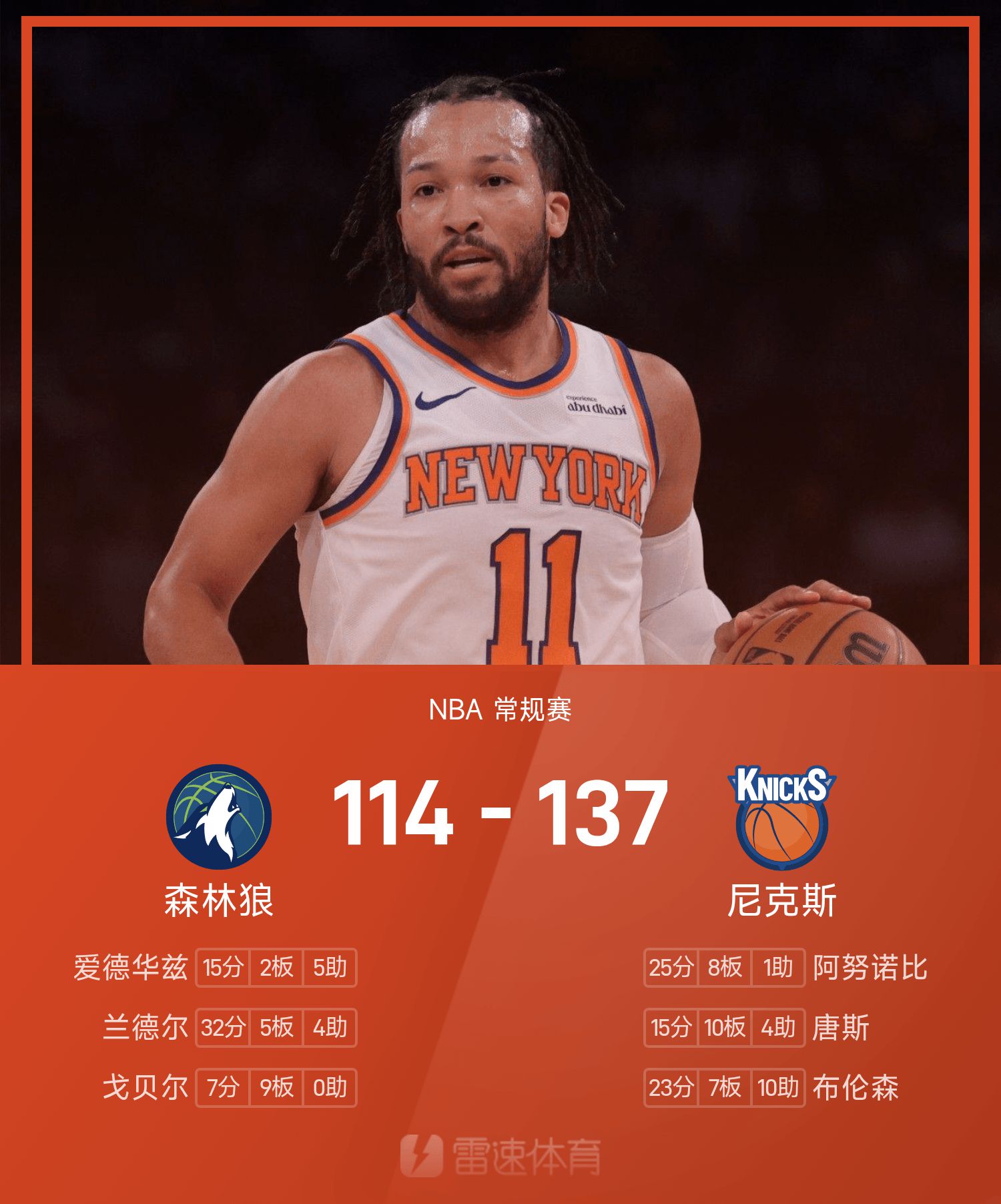 布倫森23分7搶籃板10助攻,蘭德爾332分救主323分7搶籃板10助攻,蘭德爾332分。