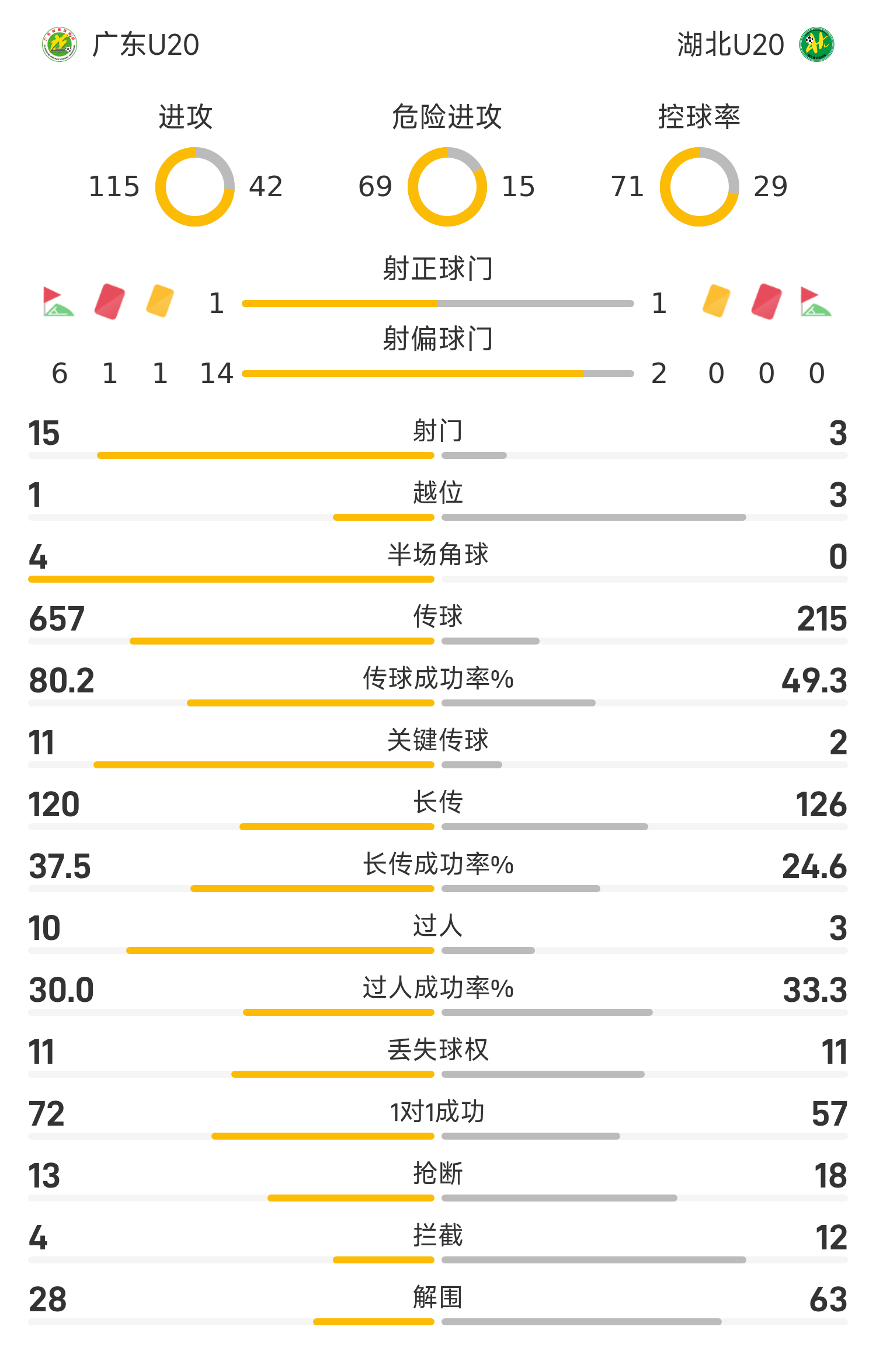 湖北U20先發陣容:1-姚浩洋、34-王康(90’25-於景澄)、11-韋所為(46’19-韋子弦)、5-餘田樂、2-孫康博、16-楊希、6-夏子豪、10-範緒林(96’8-高速)、18-熊繼政、15-姜利勳(82’14-楊博雯)、13-黃開俊(67’21-王智誠)