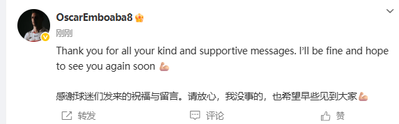 感謝球迷們發來的祝福與留言。請放心,我沒事的,也期望早點見到大家