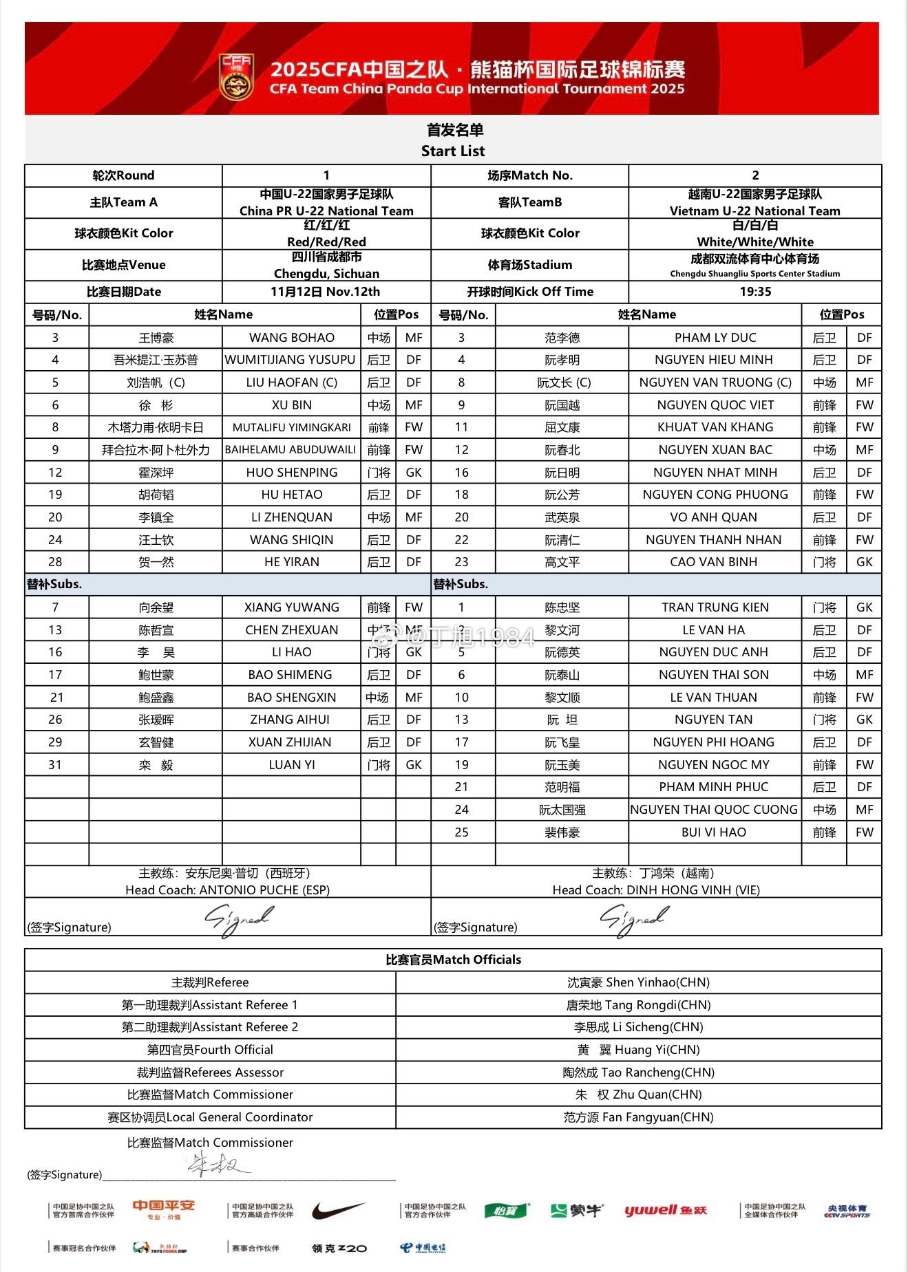 北京時間11月12日晚上19:35,2025年熊貓盃國際足球冠軍賽,中國U22男足在成都雙流體育中心體育場對陣越南U22,賽前雙方首發公佈,現效力於荷乙聯賽事鄧伯什隊的小將王博豪出戰。