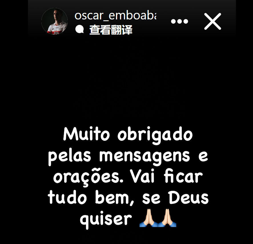 如今奧斯卡透過社媒發布動態:「非常感謝大家的慰問和祈禱,一切都會好起來的,願神保佑。」
