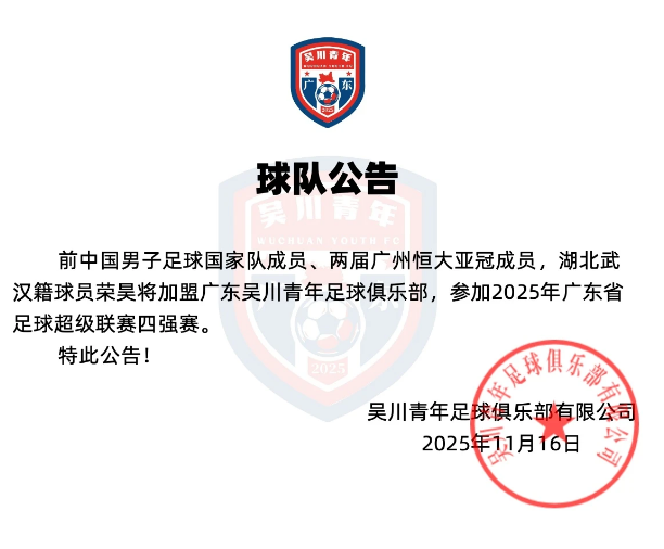 官方:榮昊加盟廣東吳川青年,參加廣東省足球超級聯賽事四強賽
