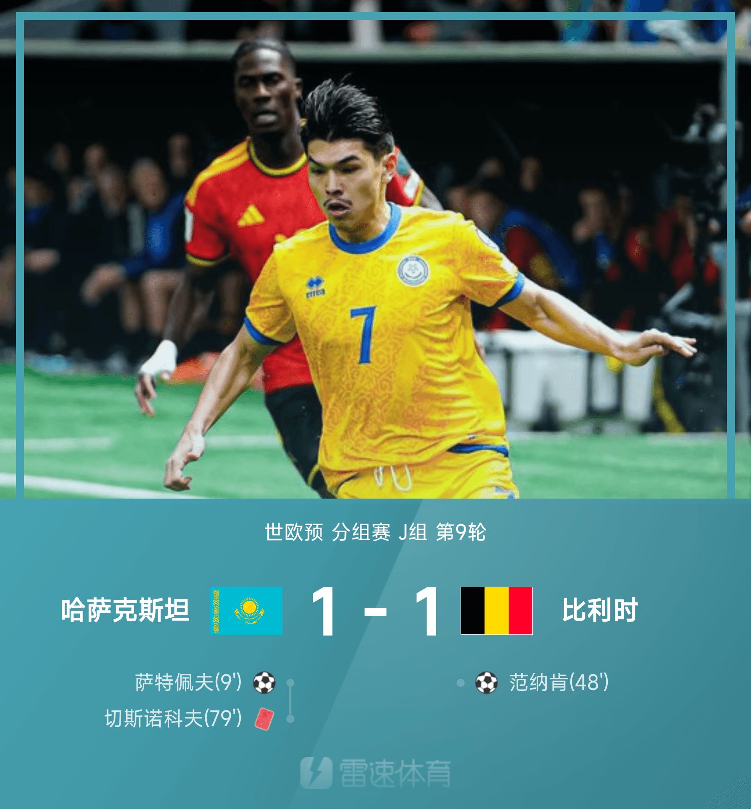 6686體育11月15日訊 26季世歐預分組賽J組第9輪,哈薩克1-1戰平比利時。上半場競賽,薩特佩夫抓住泰特差錯機會單刀破門,下半場範納肯頂球破門扳平賽果分,隨後比利時發起猛攻,切斯諾科夫蹬踏染紅,但1-1的賽果分保持到終場,比利時無緣提前晉級世杯賽。