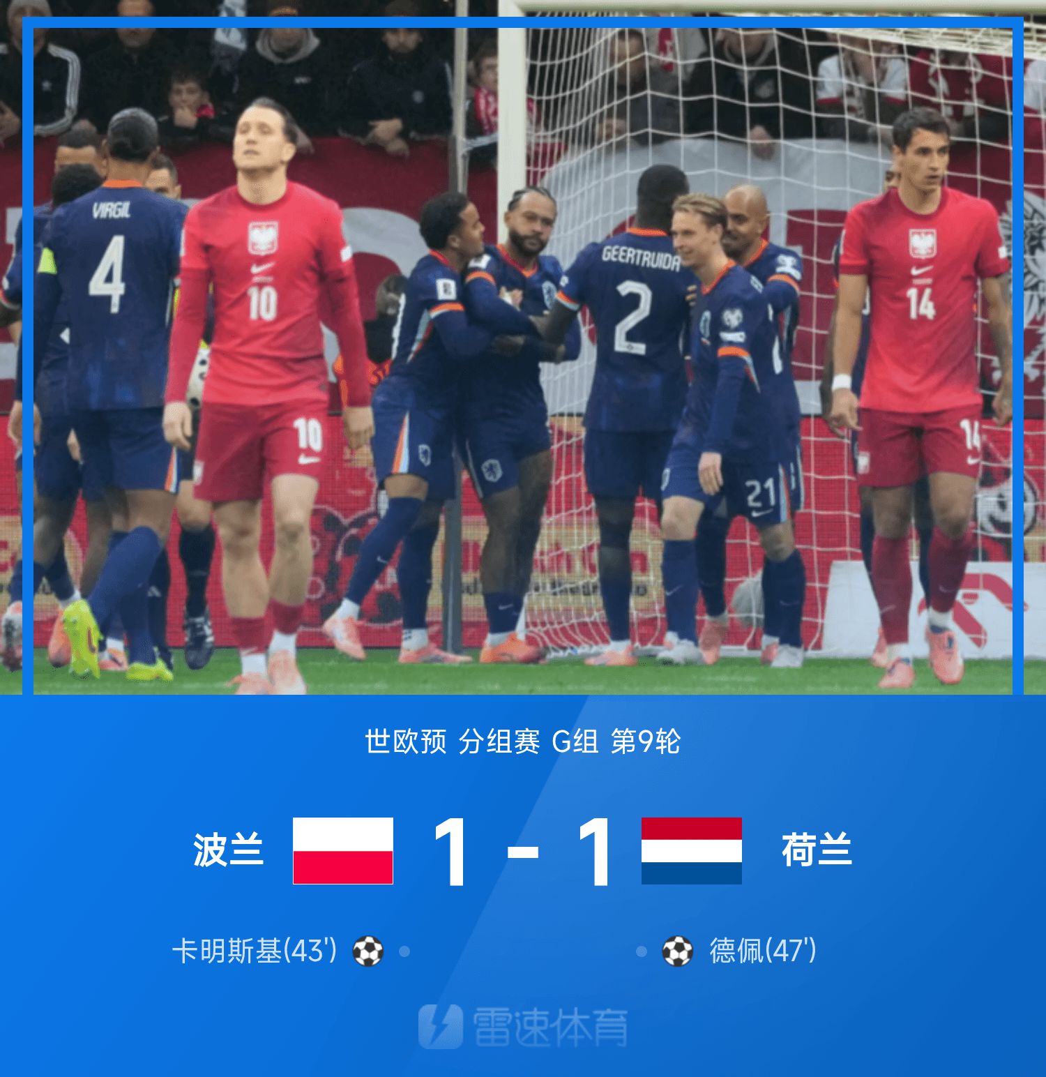 6686體育11月15日訊 26季世歐預分組賽G組第9輪,波蘭對荷蘭。上半場競賽場面沉悶,直到第43分鐘,萊萬送出秒傳協助卡明斯基單刀推遠角破門,波蘭帶著一球領先位進入中場休息。下半場剛開端,德佩在三秒區混戰中掃射破門扳平賽果分。此後雙方均未能改寫賽果分,荷蘭在客隊場1-1戰平波蘭。荷蘭目前領先波蘭3分且比波蘭多13個淨勝球,基本上鎖定一個直通美加墨世盃賽的名額。