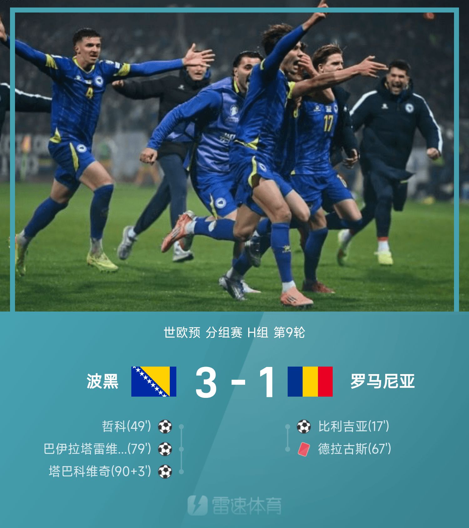 6686體育11月16日訊 26季世歐預分組賽H組第9輪,波黑坐鎮主隊場迎戰羅馬尼亞。上半場,羅馬尼亞夢幻開局,比利吉亞破門建功。下半場,波黑開端發力,哲科破守門員賽果分扳平。德拉古斯上場兩分球鐘嚴重違例染紅罰下,羅馬尼亞十人應戰波士尼亞。第79分鐘,巴伊拉塔雷維奇世界波破門逆轉局,塔巴科維奇破門鎖定戰局。比利吉亞破門難救主。最終,波士尼亞3-1戰勝十人羅馬尼亞。