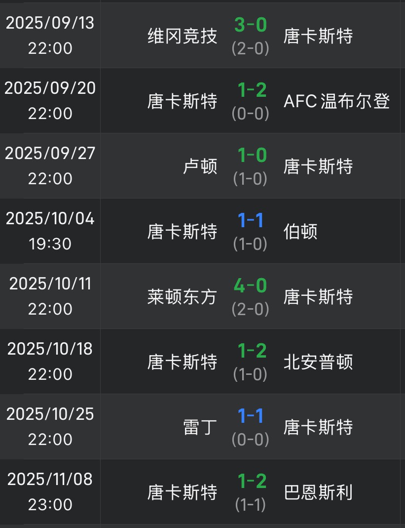 競技狀態低迷!唐卡斯特近8輪英甲未嘗勝績,僅取得2平6負