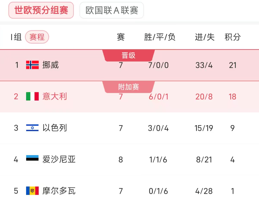 I組目前挪威21分排名第一,義大利18分排名第二,以色列(9分)、愛沙尼亞(4)、摩爾多瓦(1)都已失去競爭前兩名的期望。