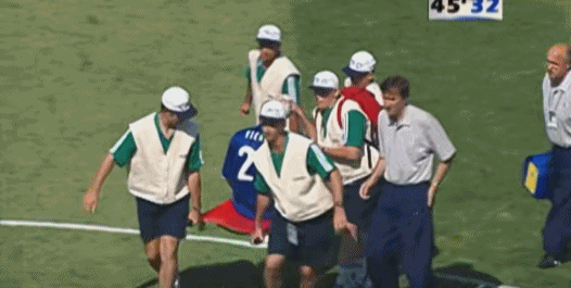 上半場補時階段,卡納瓦羅冒著受傷的風險,將球頂出端線。