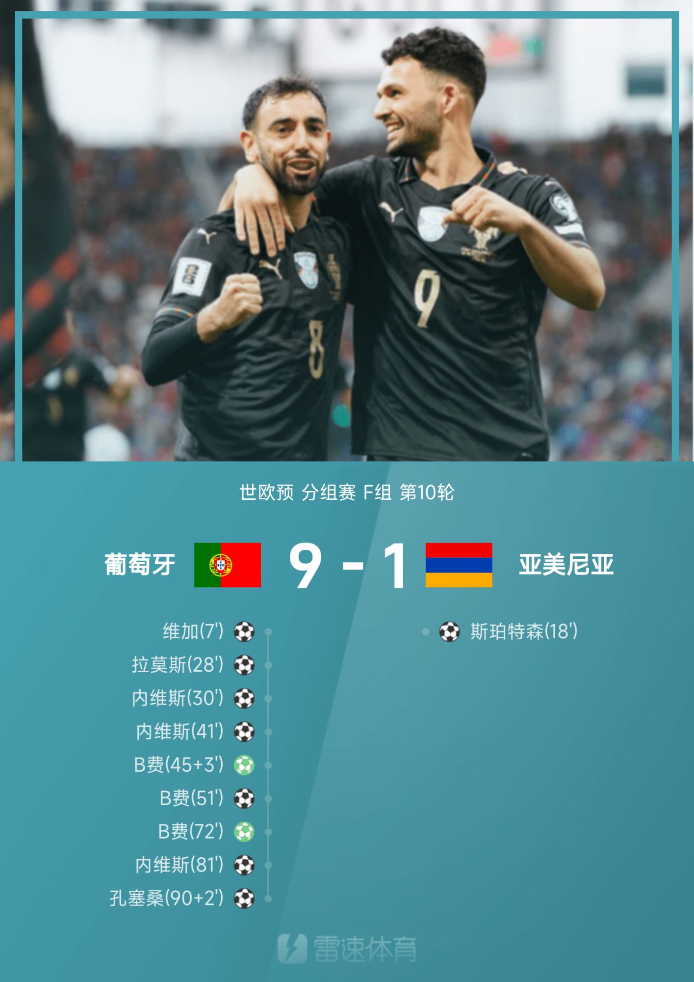 世歐預戰報:內維斯、B費戴帽,葡萄牙9-1狂勝直通世盃賽