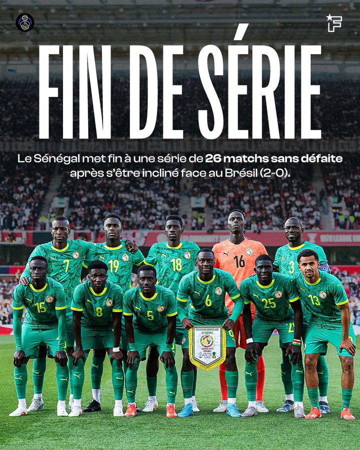 塞內加爾26場不敗紀錄遭巴西終結,上場輸球是23年9月