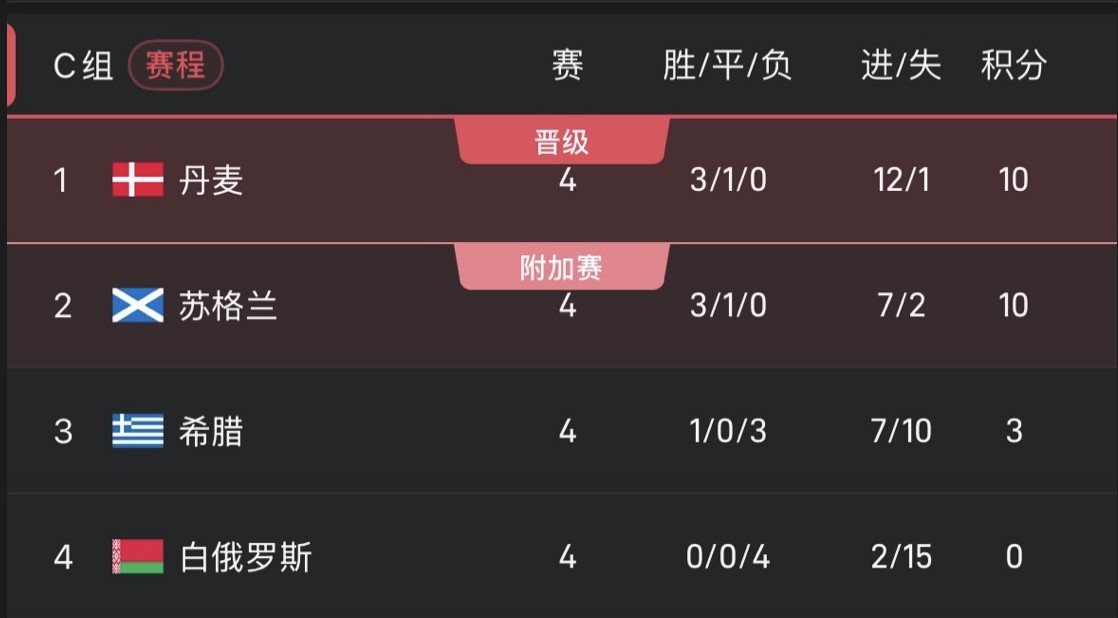 丹麥與蘇格蘭同分,兩隊將在最後一輪爭奪格拉斯哥展開直接交鋒,爭奪小組頭名。