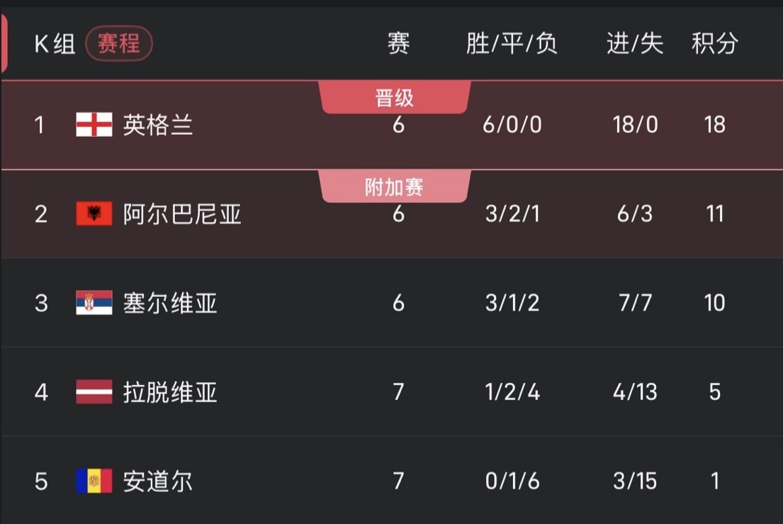 英格蘭已提前鎖定小組頭名出線。阿爾巴尼亞和塞爾維亞將爭奪小組第二。