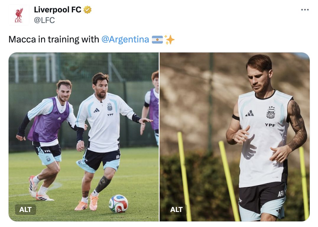 利物浦官員推曬麥卡國家隊練習照,梅西入鏡遭球迷調侃