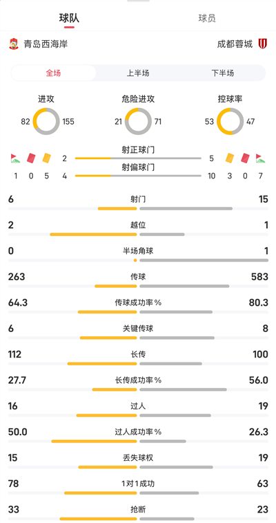 西海岸vs蓉城全場數據:打門6-15,盤球率53%-47%